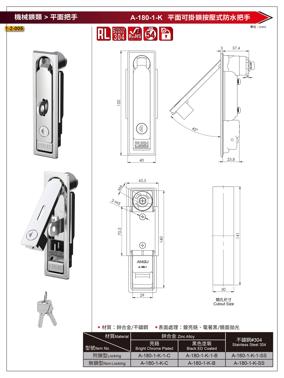 / A-180-1-K 平面可掛鎖按壓式防水把手