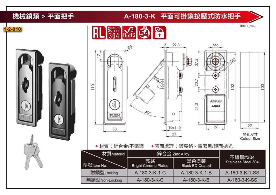 / A-180-3-K 平面可掛鎖按壓式防水把手