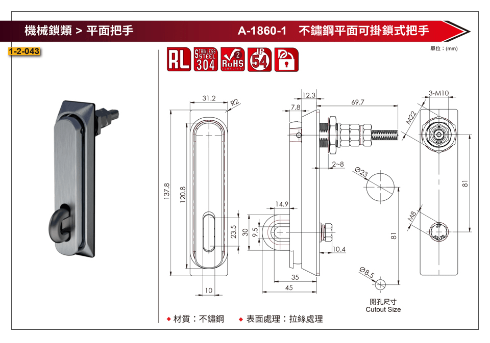 / A-1860-1 不鏽鋼平面可掛鎖式把手